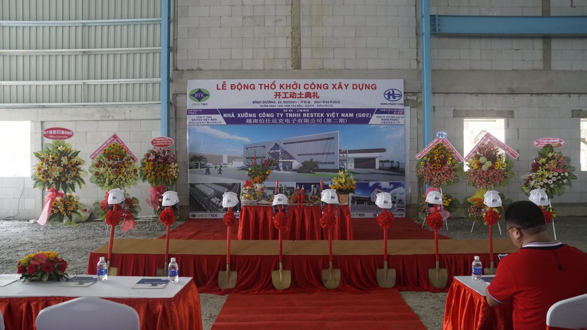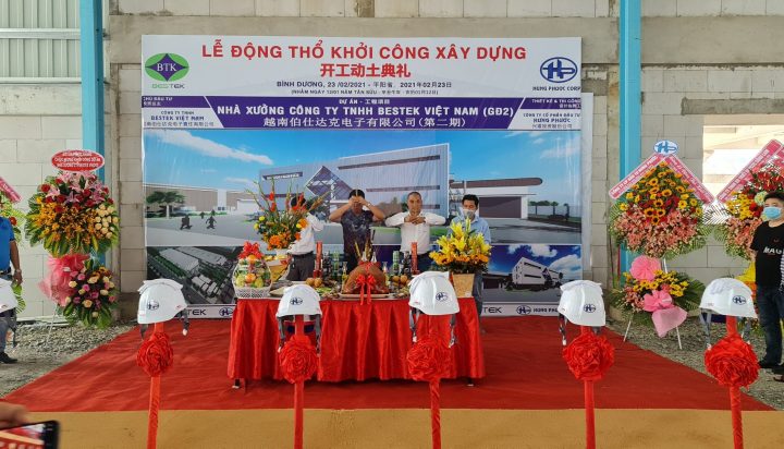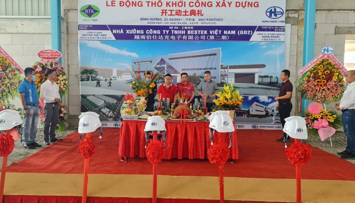 Sáng ngày 23/02/2021 tại đường NA2- Khu công nghiệp Mỹ Phước 2, thị xã Bến Cát, tỉnh Bình Dương, đã diễn ra lễ động thổ khởi công dự án Nhà xưởng công ty TNHH BESTEK VIỆT NAM – giai đoạn II, tham dự Lễ động thổ khởi công xây dựng có đại diện Chủ đầu tư ,Tổng thầu công ty CỔ PHẦN ĐẦU TƯ HƯNG PHƯỚC, và các đối tác quan trọng của dự án.