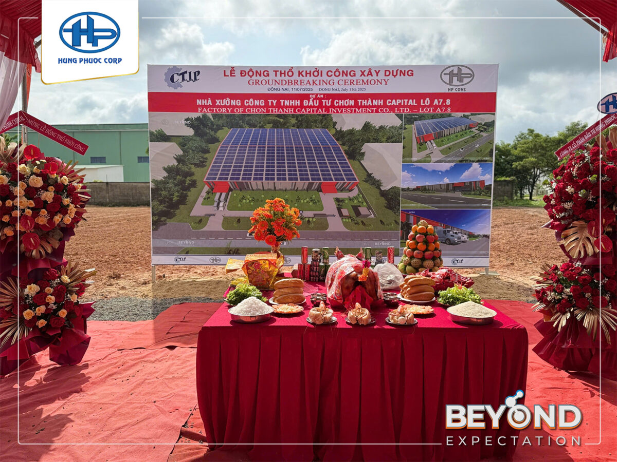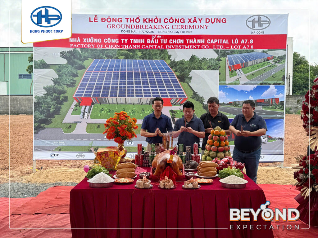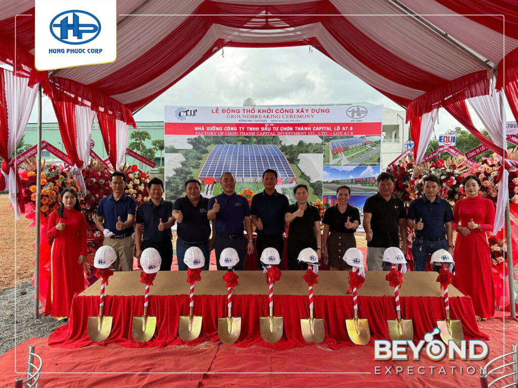 Sáng ngày 11/07/2025, Công ty Cổ phần Xây dựng Công nghiệp Hưng Phước đã long trọng tổ chức lễ động thổ, khởi công xây dựng Nhà xưởng Công ty TNHH Đầu tư Chơn Thành Capital Lô A7.8 tại KCN Chơn Thành I, Phường Chơn Thành, Tỉnh Đồng Nai, Việt Nam.