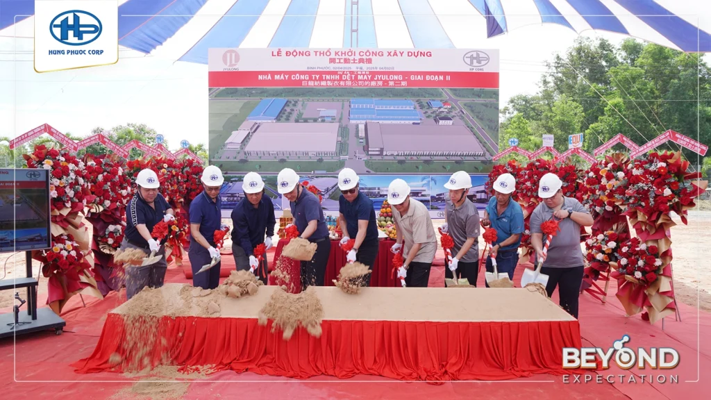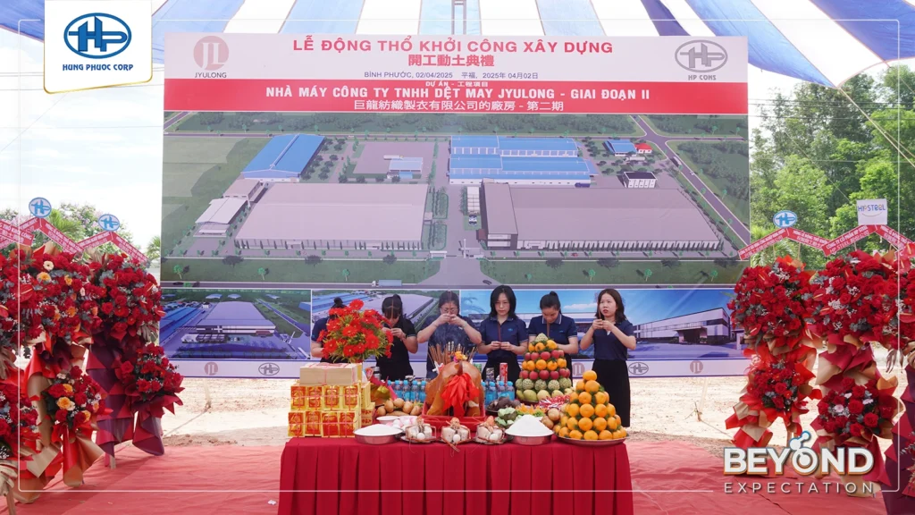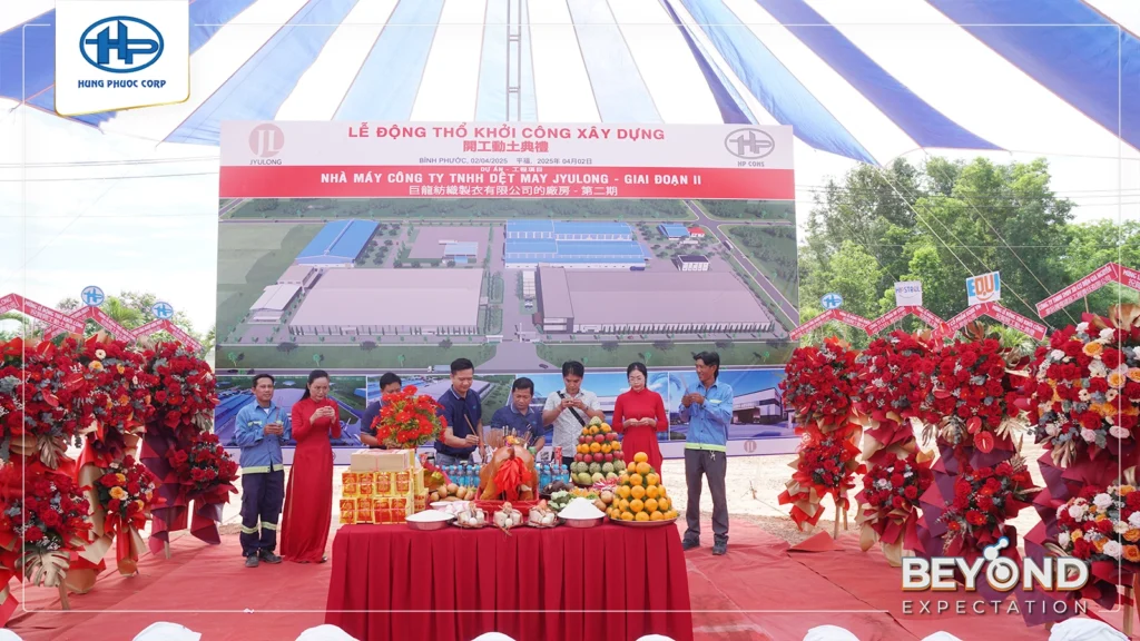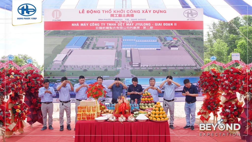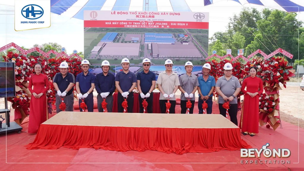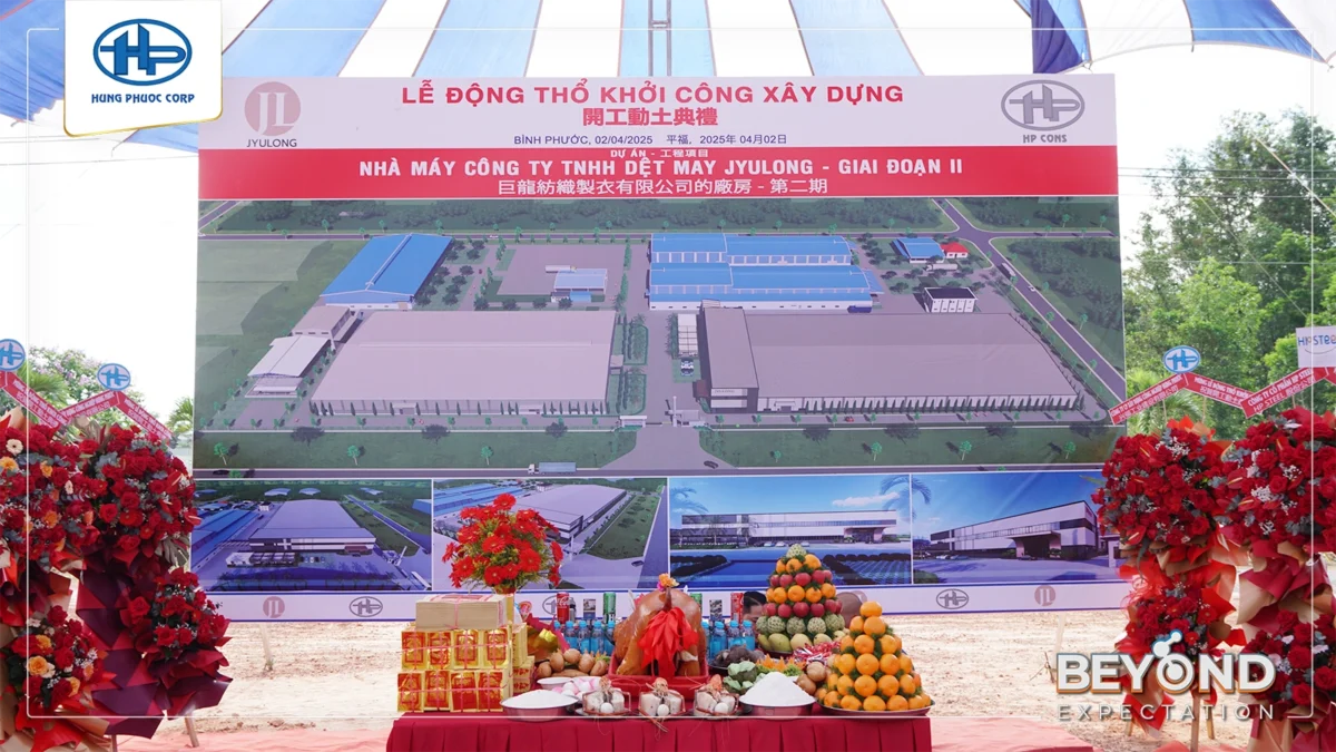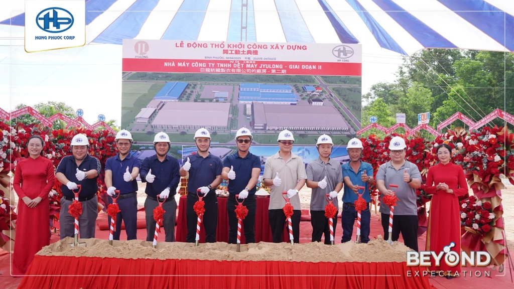 Sáng ngày 02/04/2025, Công ty Hưng Phước đã chính thức khởi công NHÀ MÁY CÔNG TY TNHH DỆT MAY JYULONG – GIAI ĐOẠN II, tại: LÔ A6.2, A6.3, A6.4, A6.5, A6.6 VÀ A6.7, KCN CHƠN THÀNH I, KHU PHỐ 2, PHƯỜNG THÀNH TÂM, THỊ XÃ CHƠN THÀNH, TỈNH BÌNH PHƯỚC, VIỆT NAM.