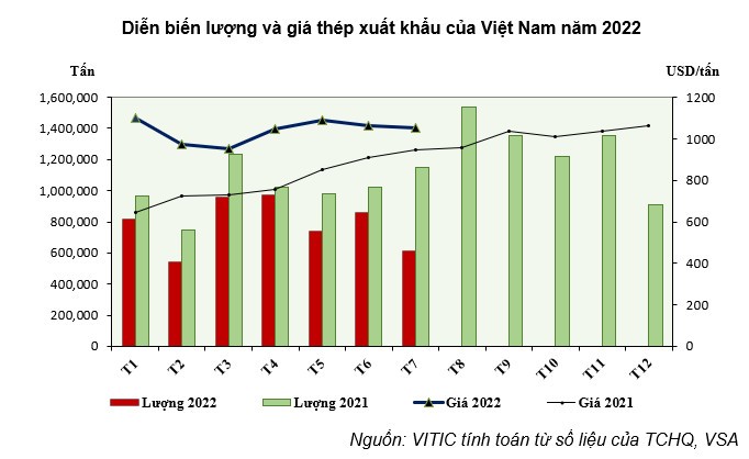 - Tính chung 8 tháng đầu năm 2022, Việt Nam đã xuất khẩu khoảng 5,92 triệu tấn thép giảm 30,27% so với cùng kỳ năm trước. Giá trị xuất khẩu đạt 6,08 tỷ USD giảm 13,35% so với cùng kỳ năm 2021.